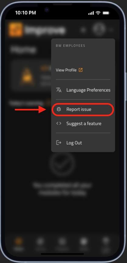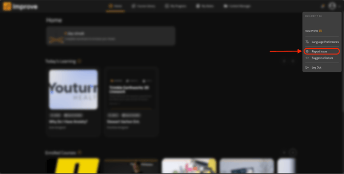 - Click on your profile icon on the top right corner and hit “Report Issue”