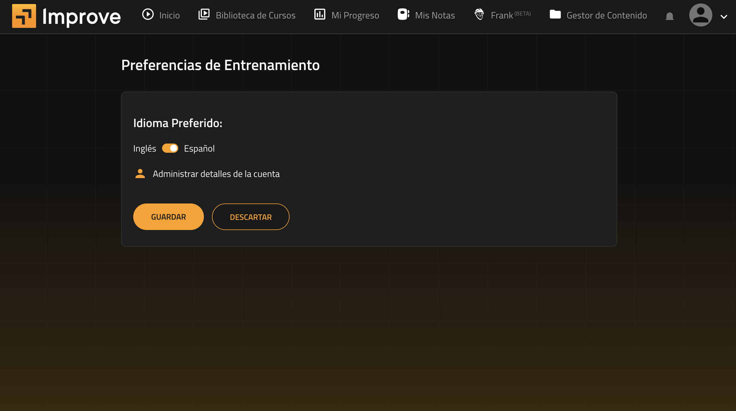 Your language setting will be applied to your account. Hit "back" or make a selection from the options in the top section ("Improve", "Inicio", etc.) to continue using Improve in your preferred language.